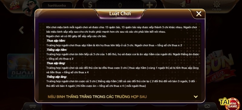 - Số lá bài được chia là 13 lá và thời lượng xếp bài là 60 giây, sau khi kết thúc thời gian xếp mỗi thành viên phải ngả bài để so sánh.