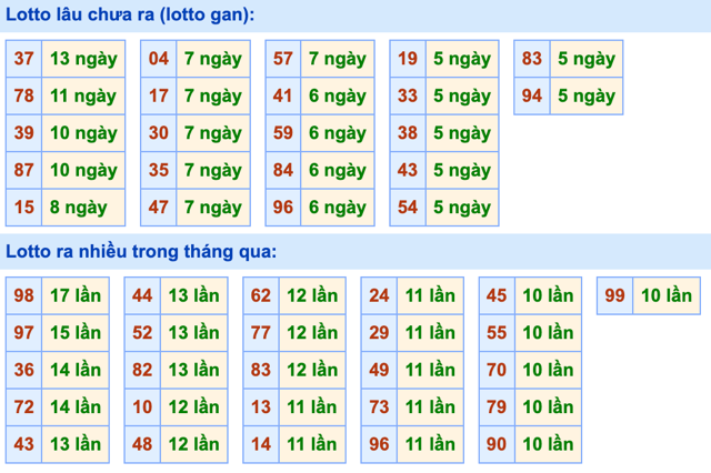 Dữ liệu chúng tôi phân tích tiếp theo đó chính là lô gan. Nếu anh em chơi lô đề hàng ngày thì không thể bỏ qua việc phân tích lô gan lâu chưa ra. Sau đây mời anh em cùng theo dõi những con lô gan lâu chưa về ở bảng bên dưới.